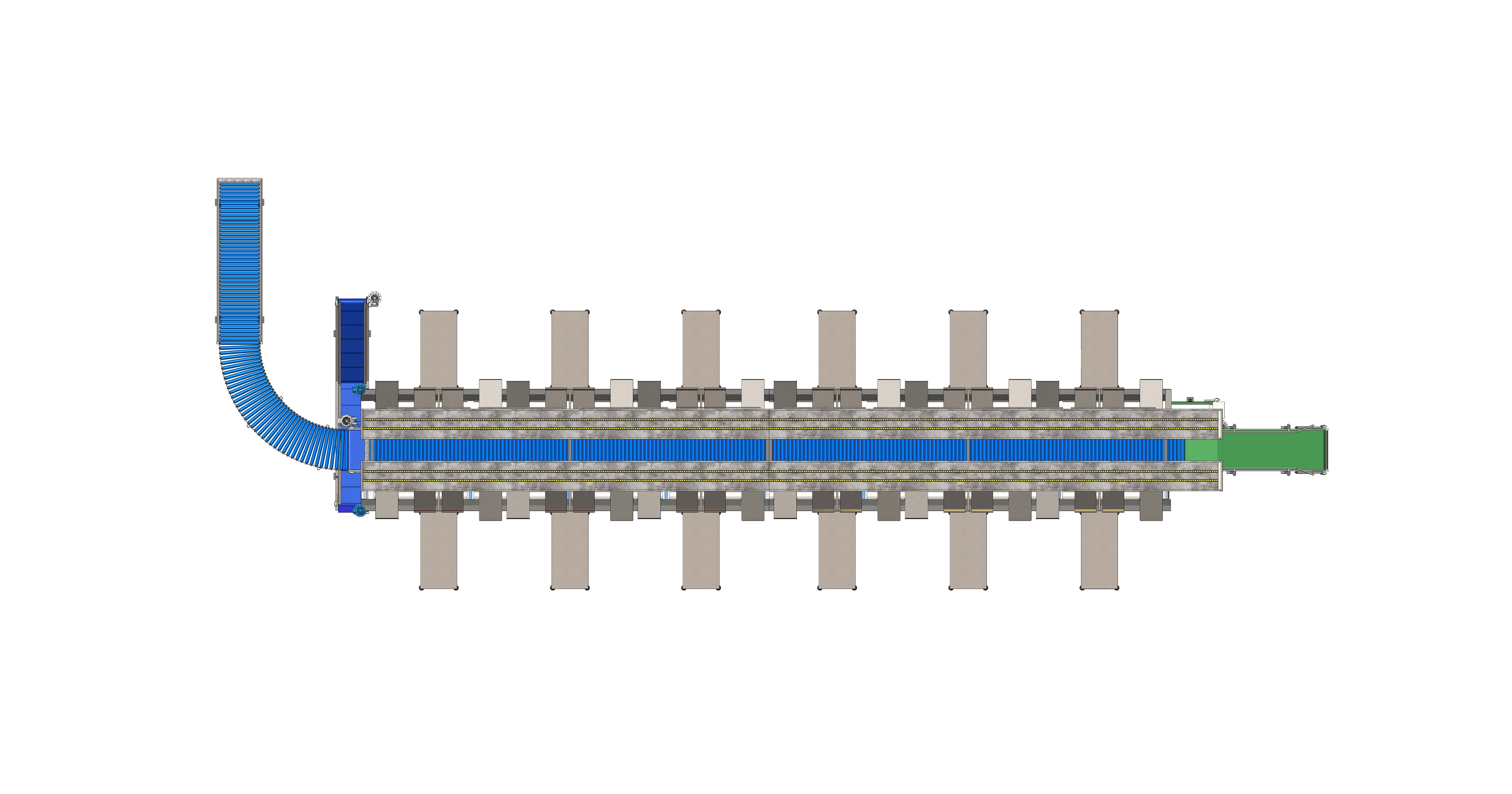 • Αλυσομεταφορείς άδειων κιβωτίων, τοποθετημένοι κάτω από τους πάγκους εργασίας, ένας σε κάθε πλευρά του κύριου σκελετού