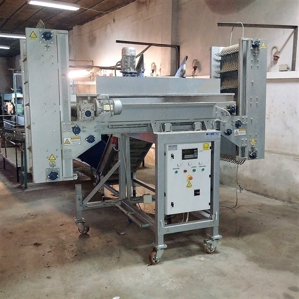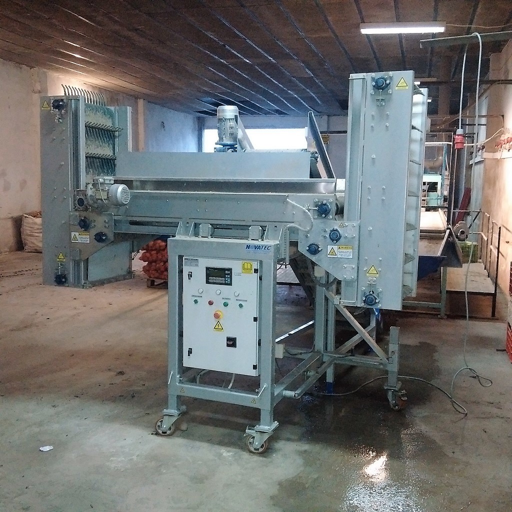 The machine is suitable for filling various size of Pallet Boxes (Bins), in an automatic mode. Suitable for products such as potatoes, onions, carrots, garlic and other hard root vegetables for filling bins and pallet box with sorted and cleaned products, helping in quick and easy packaging and storage in cold rooms or in their transport. The filling of bins or boxes is achieved in a very gentle & smooth way by preventing products hitting, through a lifting platform, controlled by photocell sensors. The food grade Finger Belt (vertical), gently delivering the product inside the lower layers of Boxes.