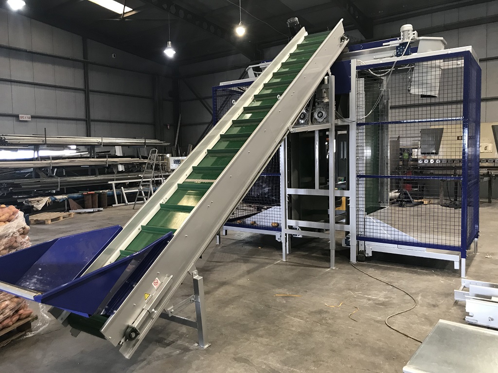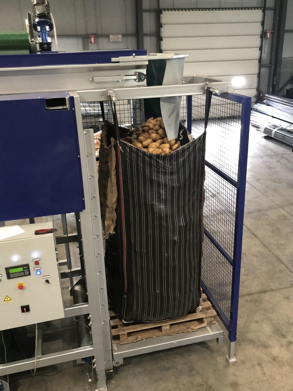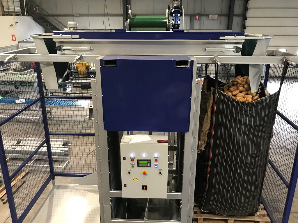 The machine is suitable for filling various size of Big - Bag (Jumbo Bags) and Pallet Boxes (Bins), in an automatic mode. Suitable for products such as potatoes, onions, carrots, garlic and other hard root vegetables for filling sacks, bags and pallet box with sorted and cleaned products, helping in quick and easy packaging and storage in cold rooms or in their transport. The filling of bags or boxes is achieved in a very gentle & smooth way by preventing products hitting, through a lifting platform, controlled by photocell sensors.
