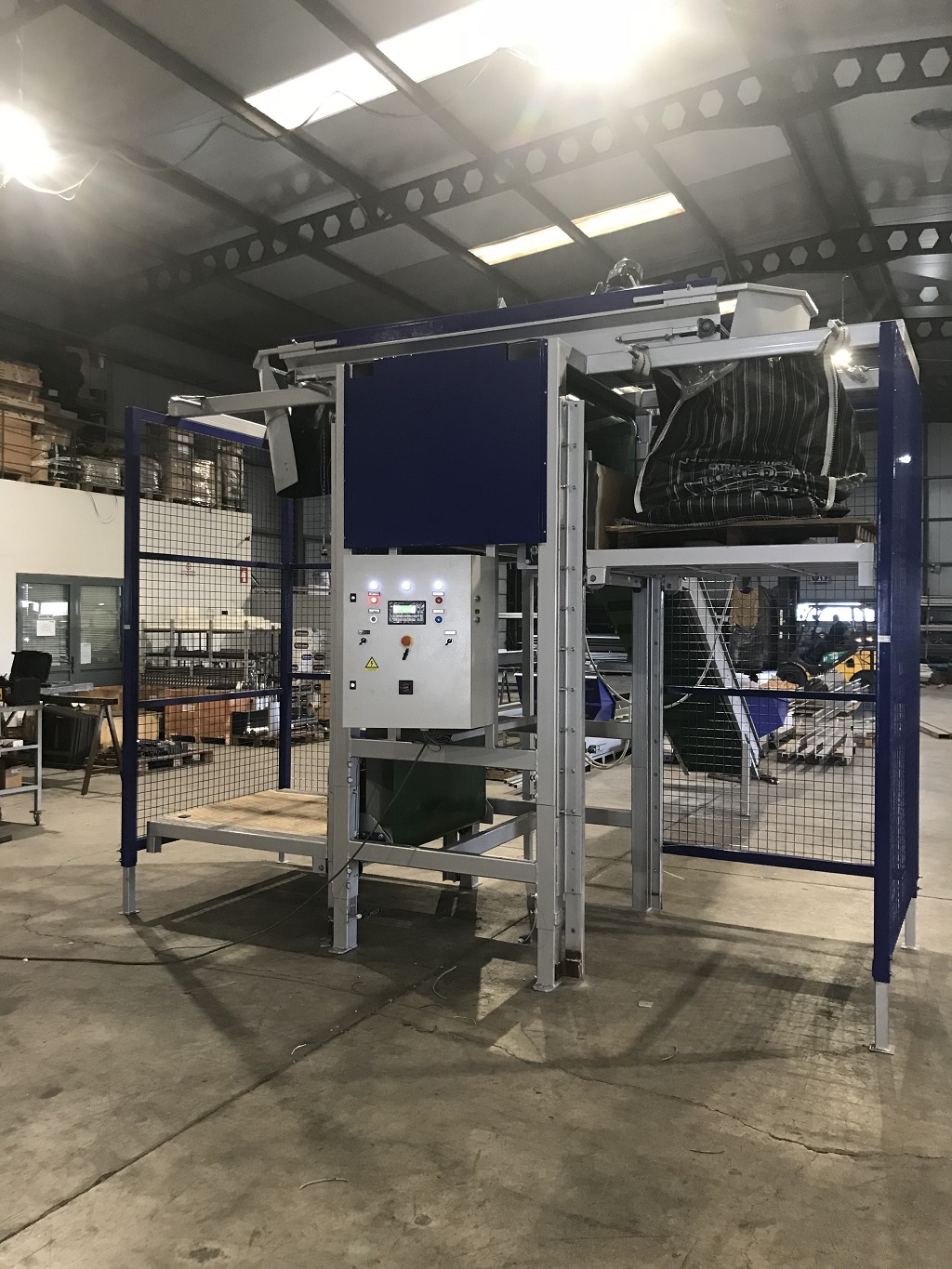 The bag is supported on the four corner hooks. The lifting platform is rising near to the cross conveyor, a sensor starts the feed, as the bag is filled the lifting platform goes down and when the bag is full the lifting platform stops in the lower position.