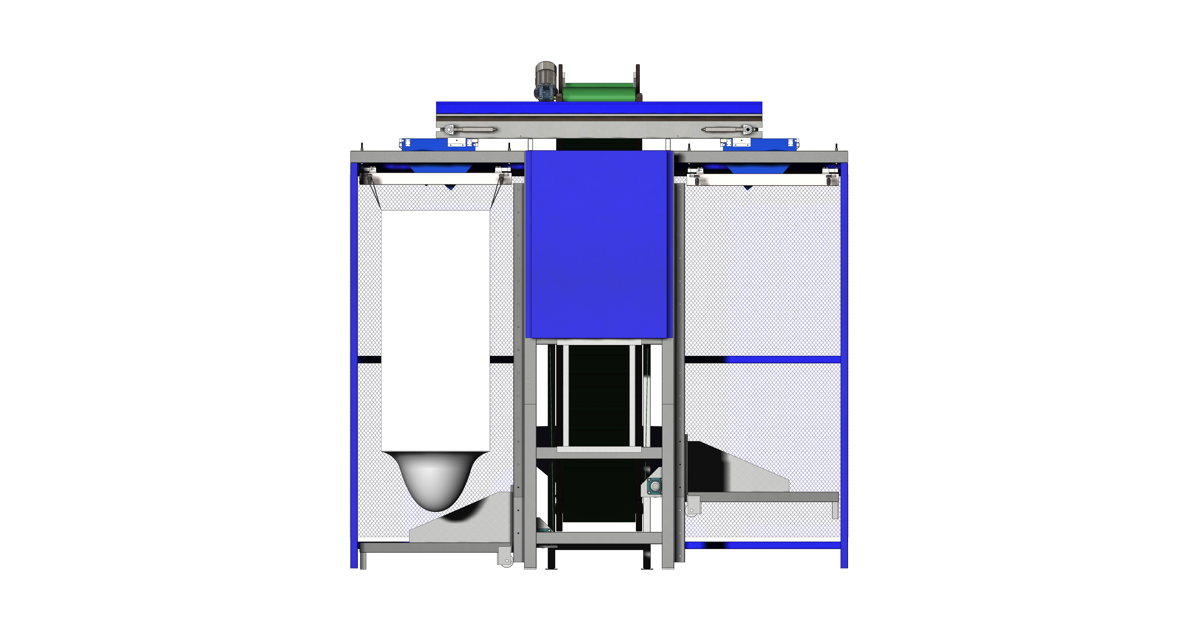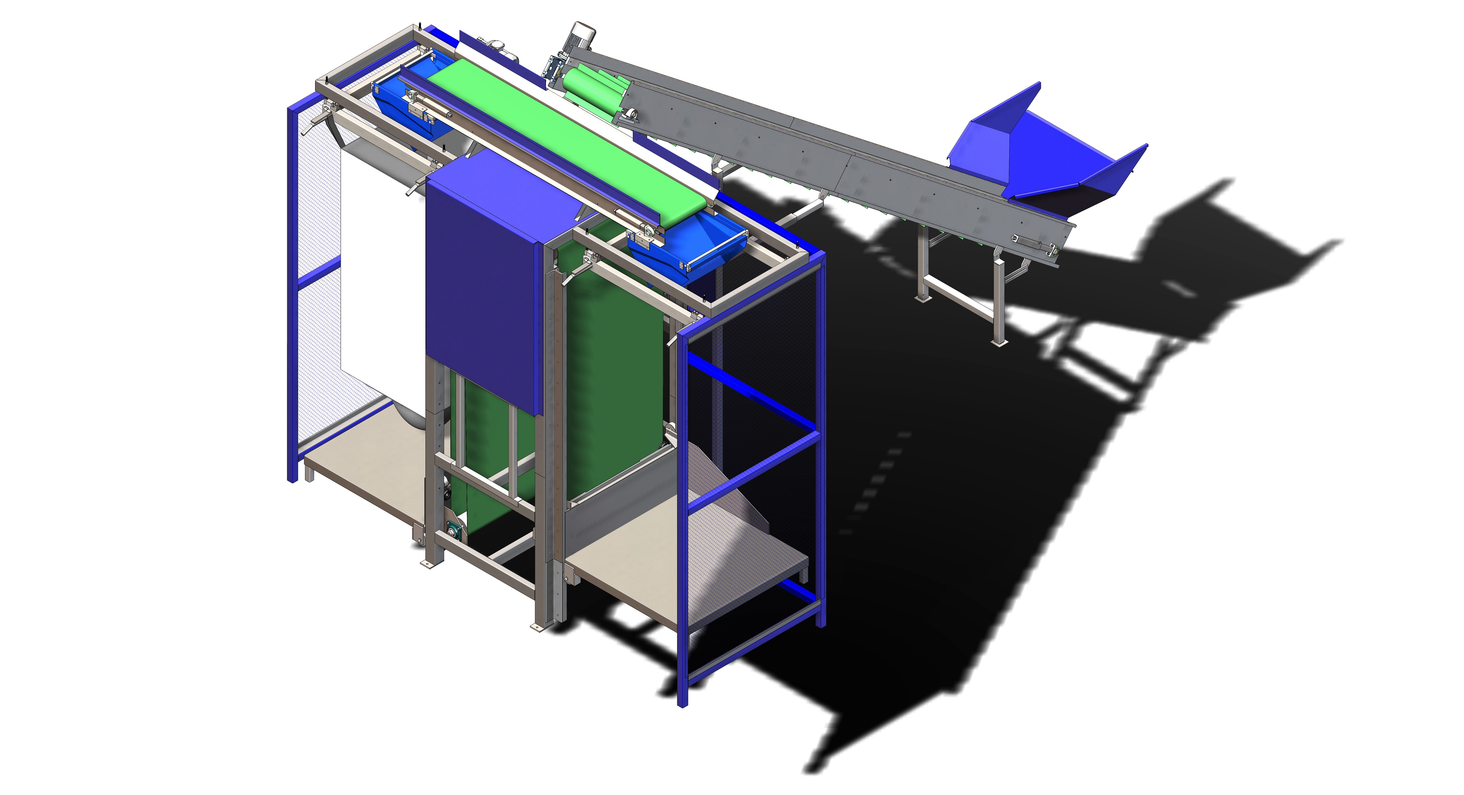 • Two (2) special type sensors for controlling the filling rate, placed in the end of each lifting platform. As the bag or box is filled the sensor reacts and activates the step by step descent of the platform system. When the box or the bag is full, the horizontal belt reverses motion in order to fill the other side bag placed on the platform.
