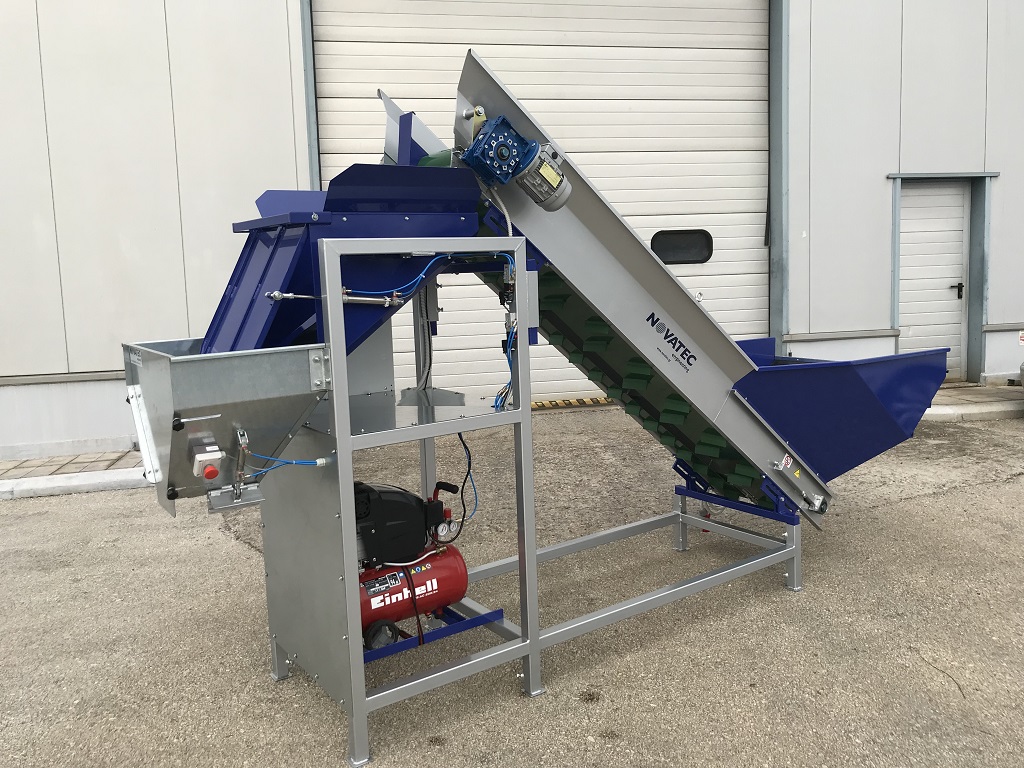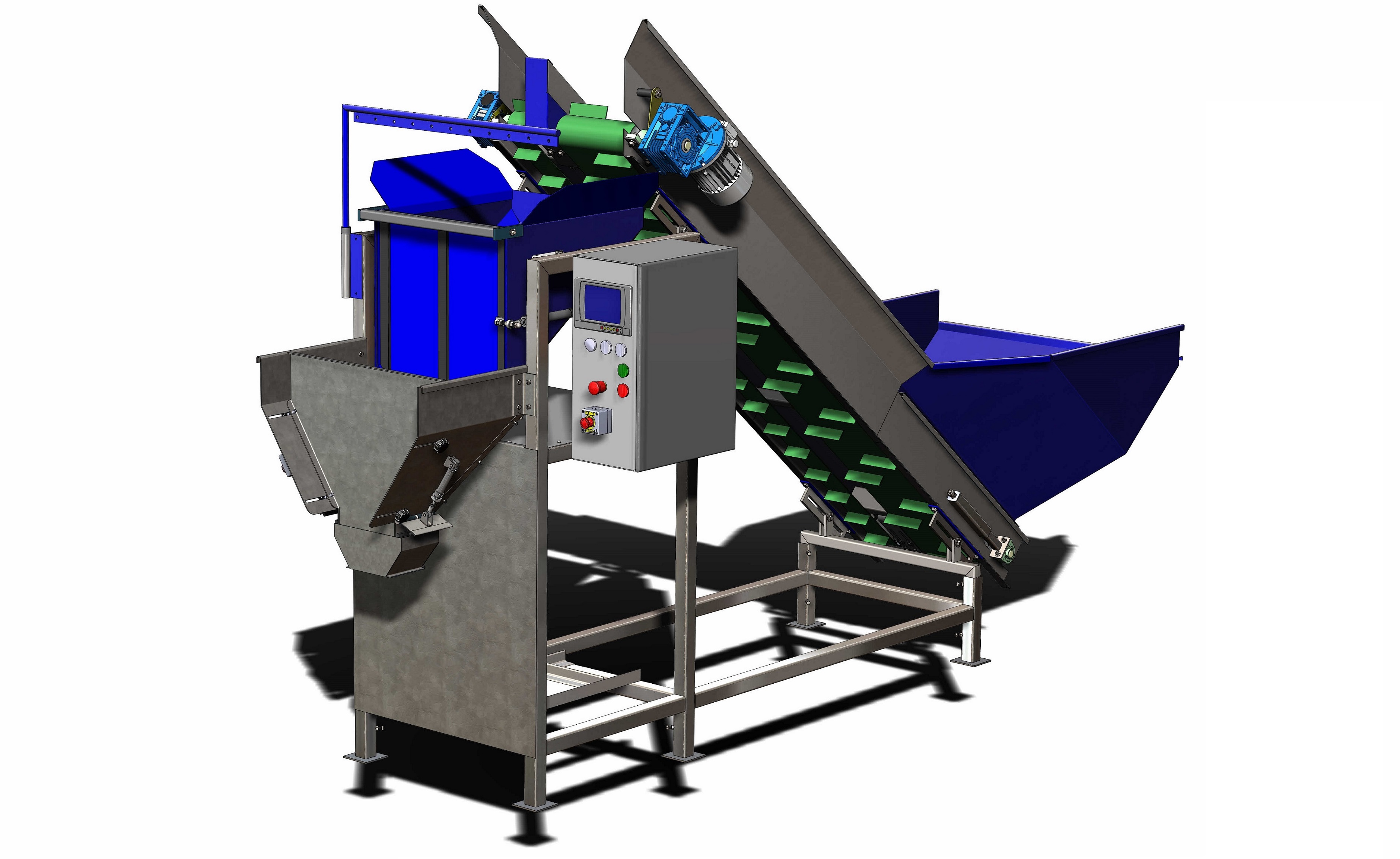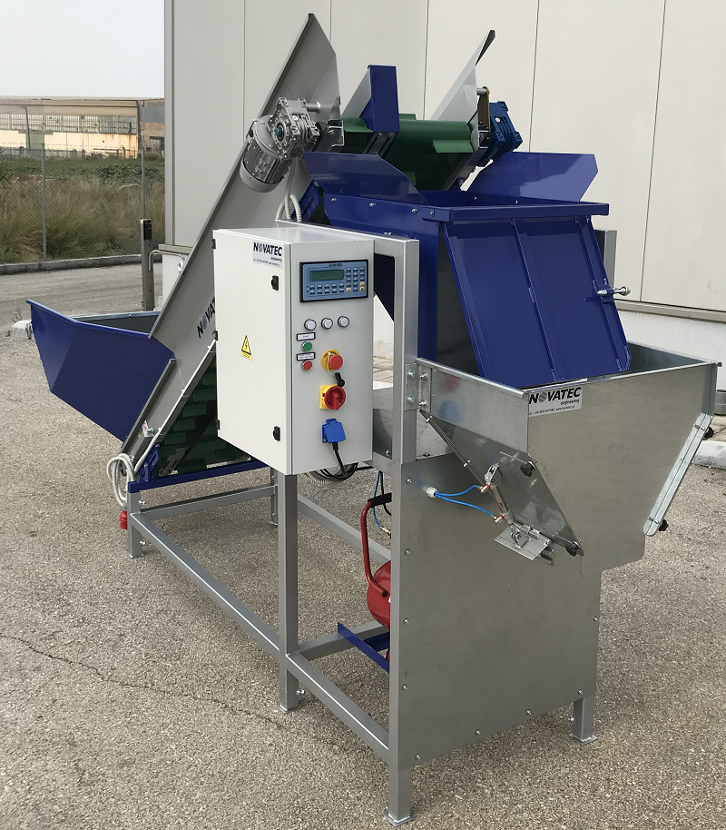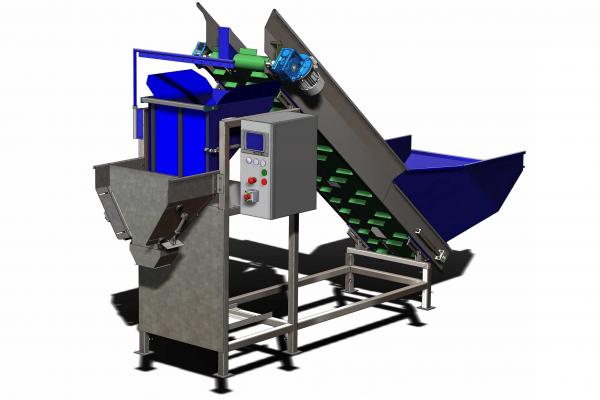 The Weighing Machine is a unit designed for easy weighing and packing of hard vegetables like potatoes, carrots, onions etc. The machine uses two belts to fill the weighing bin. When the required weight is approached, the wide belt stops. The narrow belt keeps moving slower, through an Inverter, in order to reach the target weight, with the best possible accuracy. Once the product is released from the weighing hopper, a new cycle begins.